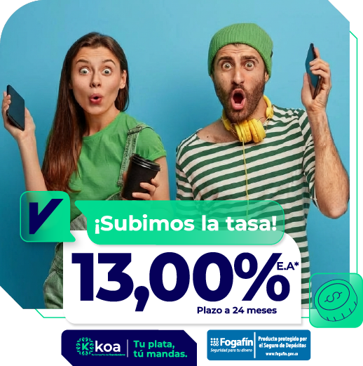 En KOA creemos que invertir no debe ser exclusivo de unos pocos. Con este CDT queremos que más colombianos encuentren alternativas sencillas, rentables y confiables para hacer crecer sus ahorros. Este producto es 100% digital, está protegido por el Seguro de Depósitos de Fogafín.