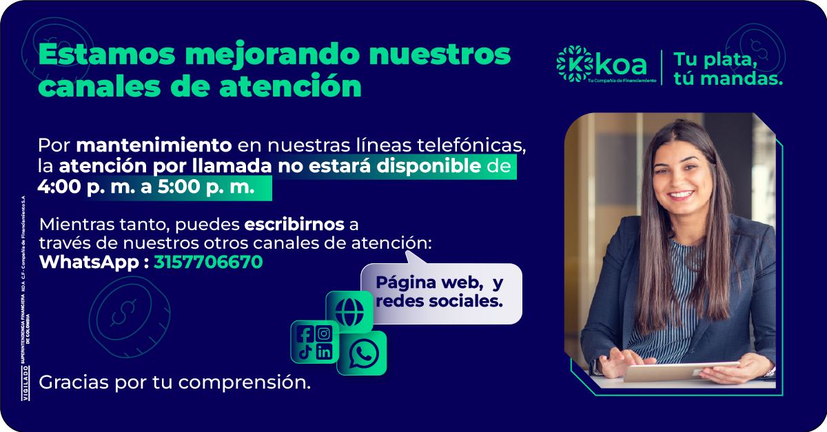 KOA es una Compañía de Financiamiento que romperá con las reglas de la banca tradicional para darte productos simples, 100% digitales y sin papeleo. Aquí no hay filas, ni trámites eternos: tú manejas tu dinero desde tu celular, tú decides cuándo y cómo invertir, tú mandas sobre tu plata. Así empieza la revolución financiera en Colombia. Bienvenido a KOA
